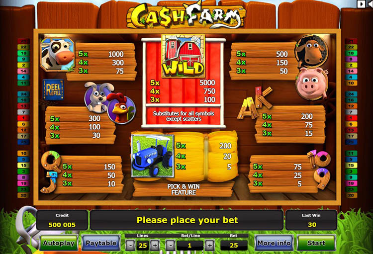 В слоте Cash Farm отсутствует традиционный раунд фриспинов, но его заменяет увлекательная и потенциально очень прибыльная бонусная игра Pick & Win.